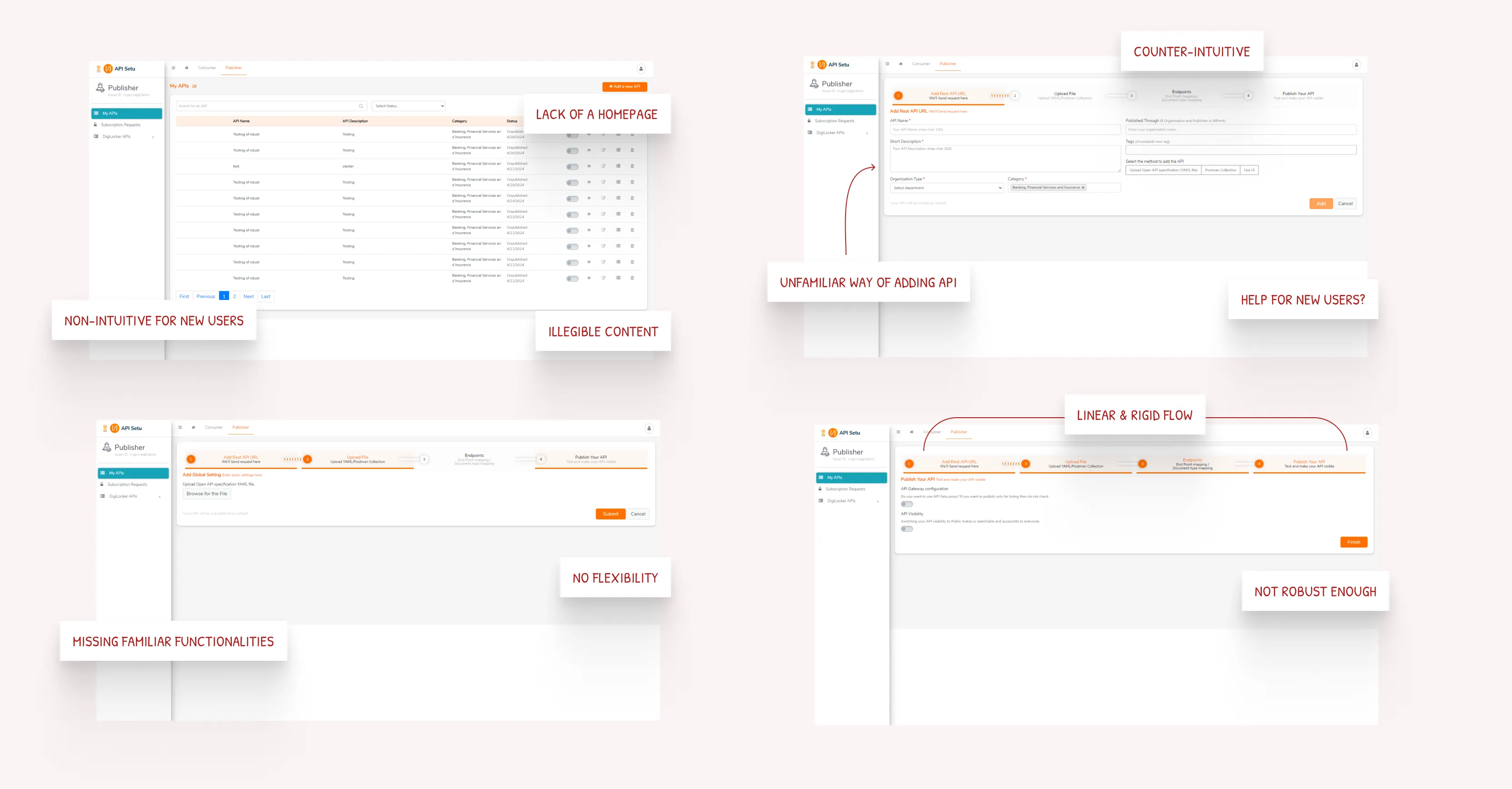 API Setu was functional. APIs were being published and consumed. But spend any time with it and the cracks showed up fast. The platform assumed you'd figure it out. There was no guidance for new users, no flexibility for experienced ones, and nothing that communicated why this platform was worth trusting.